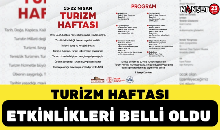 Turizm Haftası etkinlikleri, 15 Nisan Çarşamba günü Elazığ Valiliği ziyareti ile başlayacak. Aynı gün Demokrasi Meydanı’nda fotoğraf sergisi açılışı yapılacak. Program kapsamında 16 Nisan Perşembe günü uçurtma şenliği, halk oyunları gösterileri ve Harput gezisi düzenlenecek.