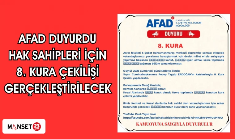 AFAD Elazığ İl Müdürlüğü'nden yapılan duyuruya göre, hak sahipleri için 8. kura çekilişi gerçekleştirilecek.