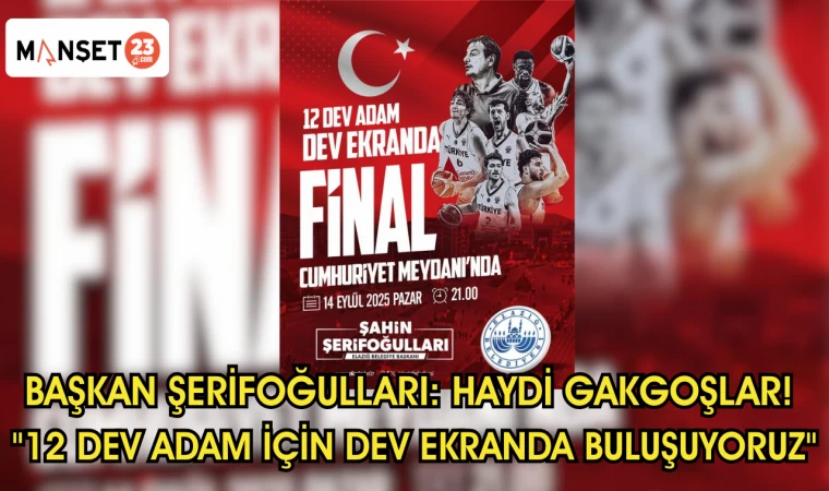 Elazığ Belediye Başkanı Şahin Şerifoğulları, Elazığlı sporseverlere heyecan verici bir müjde verdi. Türkiye A Milli Basketbol Takımı’nın Almanya ile oynayacağı final karşılaşması için Cumhuriyet Meydanı’na dev ekran kurulacak. Başkan Şerifoğulları, sosyal medya hesabından yaptığı paylaşımda; "Haydi Gakgoşlar, 12DevAdam için buluşuyoruz. Milli takımımızın Almanya ile oynayacağı final maçını birlikte izlemek üzere pazar saat 21.00’de Cumhuriyet Meydanı’na dev ekran kuruyoruz. Bu tarihi heyecana hep birlikte şahit olalım, ay-yıldızlı bayrağımızın etrafında tek yürek olalım" ifadelerini kullandı.