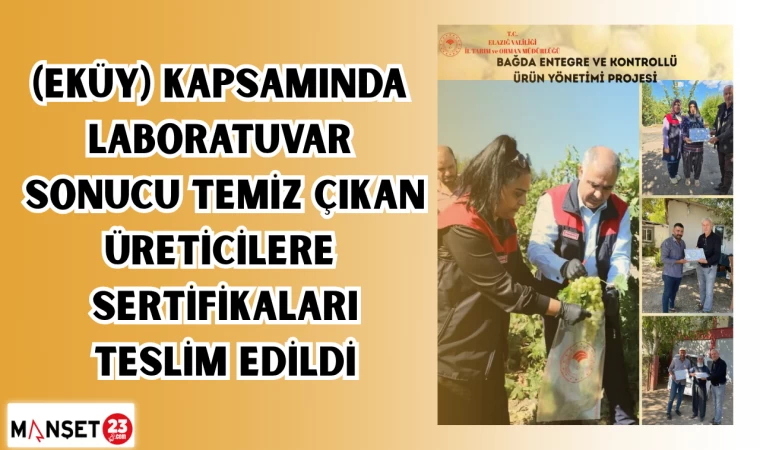 Hasat döneminin yaklaşmasıyla birlikte alınan ürün numuneleri laboratuvarlarda analiz edilerek, kalıntı yönünden temiz çıkan üreticilere EKÜY logosu ve sertifikaları düzenlendi. Hazırlanan logo ve sertifikalar, İl Tarım ve Orman Müdürlüğü teknik personeli tarafından gerçekleştirilen çiftçi ziyaretleri sırasında üreticilere teslim edildi.
