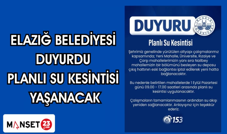 Elazığ Belediyesi'nin yürüttüğü altyapı çalışmaları kapsamında, Yeni Mahalle, Üniversite, Rızaiye, Çarşı ve Nailbey mahallelerinin bir bölümünde planlı su kesintisi yapılacak.