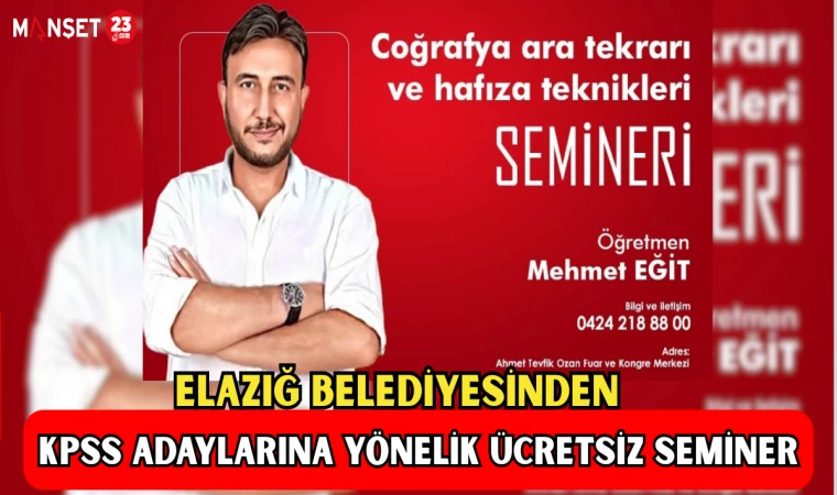 Bu doğrultuda Elazığ Belediyesi tarafından KPSS adaylarına yönelik coğrafya ara tekrarı ve hafıza teknikleri semineri düzenlenecek. Eğitimci Mehmet Eğit’in gerçekleştireceği seminer, 16 Ocak Cuma günü 13.30-16.30 saatleri arasında Ahmet Tevfik ozan Fuar ve Kongre Merkezi’nde yapılacak. Seminere katılmak isteyen gençler, 04242188800 numaralı telefondan bilgi alabilecek.