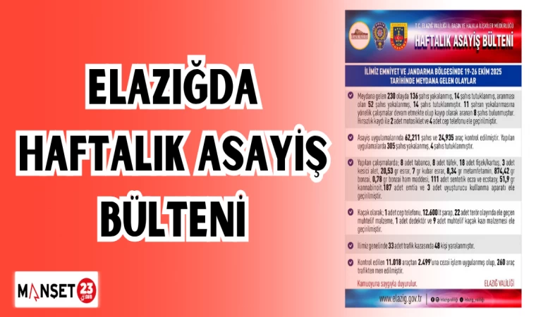 ELAZIĞ'DA HAFTALIK ASAYİŞ BÜLTENİ