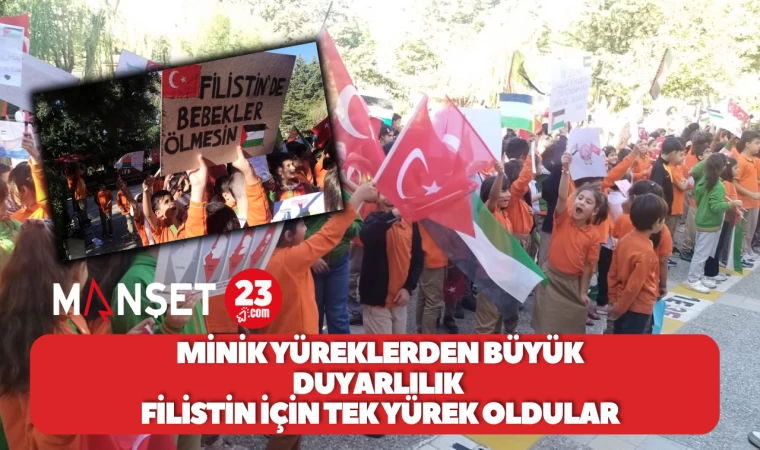 Okul bahçesinde düzenlenen programda, minik öğrenciler Filistin halkına destek olmak amacıyla bir araya geldi. Ellerinde taşıdıkları “Filistin’e Özgürlük”, “Zulme Sessiz Kalma” ve “Çocuklar Ölmesin” yazılı pankartlarla dikkat çeken öğrenciler, İsrail’in saldırılarını kınayan sloganlar atarak dünyaya barış çağrısında bulundular.