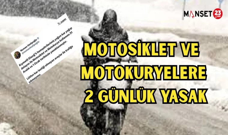 Elazığ Valiliği ve ilgili birimlerce alınan karar doğrultusunda, 31 Aralık ve 1 Ocak tarihlerini kapsayacak şekilde iki gün boyunca motosiklet kullanımı durduruldu. Özellikle kurye hizmeti veren işletmelerin bu karara uyması istenirken, yasağın buzlanma ve don riskine karşı bir önlem olduğu vurgulandı.