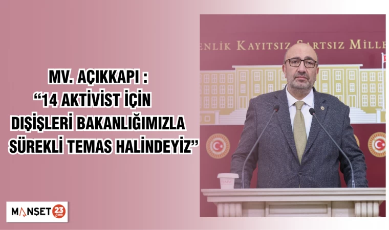 AK Parti Elazığ Milletvekili Ejder Açıkkapı, İsrail'in Küresel Sumud Filosu'nda alıkoyduğu 14 Türk vatandaşının yurda dönüşüne ilişkin, "14 aktivist için Dışişleri Bakanlığımızla sürekli temas halindeyiz. Bu kardeşlerimiz inşallah birkaç gün içerisinde ülkemize gelmiş olacaklar." dedi.