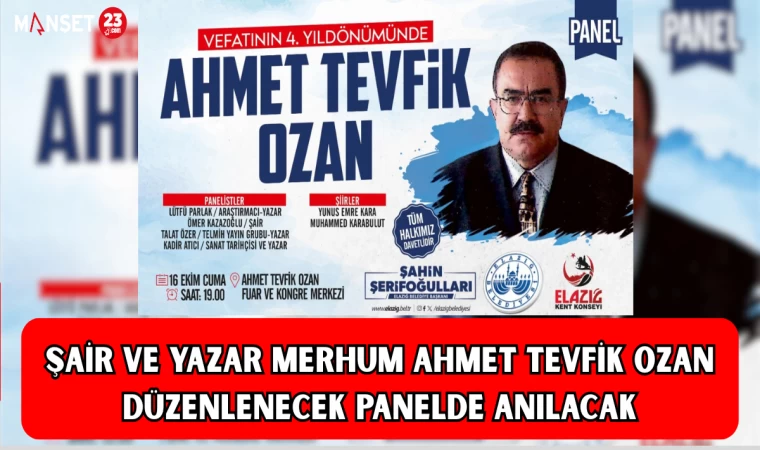Elazığ Belediyesi ve Elazığ Kent Konseyi iş birliği ile 16 Ocak Cuma günü düzenlenecek panelde, Şair ve Yazar Merhum Ahmet Tevfik Ozan anılacak.