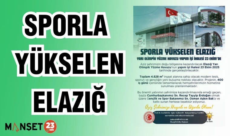 Doğu bölgesine beklenen bir spor yatırımı için ilk adım atılıyor. Elazığ Yarı Olimpik Yüzme Havuzunun yapım işi ihalesi, 23 Ekim 2025 tarihinde gerçekleştirilecek.
