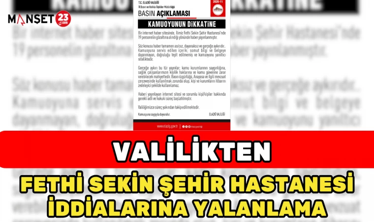 Elazığ Valiliği, bazı internet sitelerinde yer alan “Fethi Sekin Şehir Hastanesi’nde 19 personelin gözaltına alındığı” yönündeki haberlerin gerçeği yansıtmadığını açıkladı.