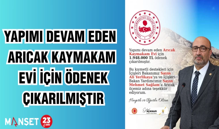 AK Parti Elazığ Milletvekili Ejder Açıkkapı, Arıcak'taki "Kaymakam Evi" projesi için verilen 2 milyon TL tutarındaki ek ödenek kapsamında süreçte emeği geçen İçişleri Bakanı Ali Yerlikaya ve İçişleri Bakan Yardımcısı Mehmet Sağlam’a teşekkür etti.