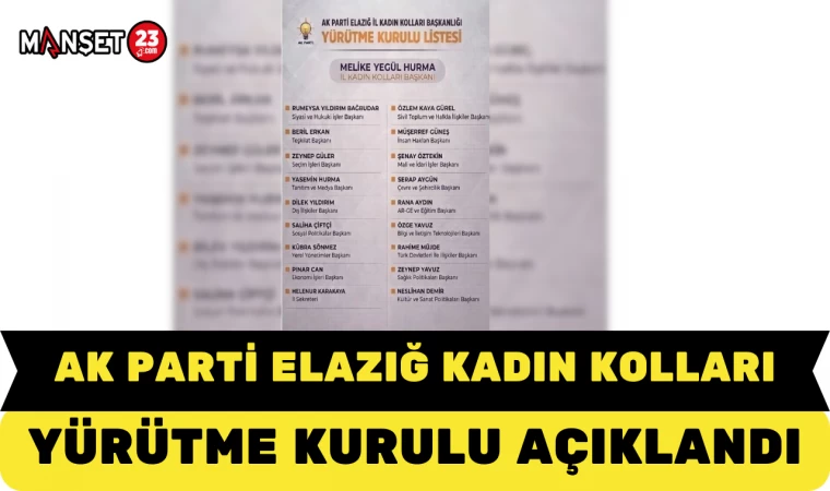 Adalet ve Kalkınma Partisi (AK Parti) Elazığ İl Kadın Kolları Başkanlığı’nın yeni dönem yürütme kurulu listesi kamuoyuyla paylaşıldı. Kadın kolları teşkilatlanmasında görev alacak isimler belirlenirken, İl Kadın Kolları Başkanlığı görevini Melike Yegül Hurma yürütmeye devam edecek.