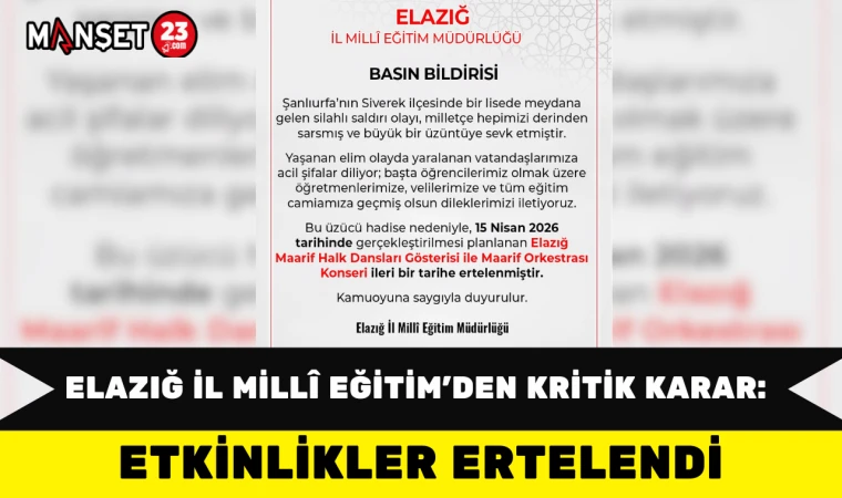 Elazığ İl Millî Eğitim Müdürlüğü, Şanlıurfa’nın Siverek ilçesinde bir lisede meydana gelen silahlı saldırı sonrası planlanan etkinliklerin ertelendiğini duyurdu. Yapılan açıklamada, “Şanlıurfa’nın Siverek ilçesinde bir lisede meydana gelen silahlı saldırı olayı, milletçe hepimizi derinden sarsmış ve büyük bir üzüntüye sevk etmiştir.” ifadelerine yer verildi.