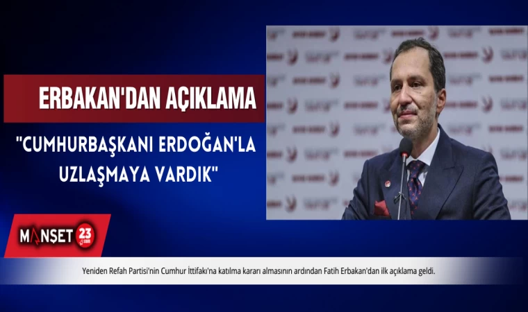 Yeniden Refah Partisi'nin Cumhur İttifakı'na katılma kararı almasının ardından Fatih Erbakan'dan ilk açıklama geldi. Yeniden Refah lideri Erbakan, "Cumhurbaşkanı Erdoğan ile Külliye'de görüştük. Partimizin ittifak sürecinde başından itibaren talep ettiğimiz prensipler konusunda uzlaşmaya vardık. Cumhurbaşkanlığı adaylığı sürecimizi de sonlandırmış bulunuyoruz." ifadelerini kullandı.