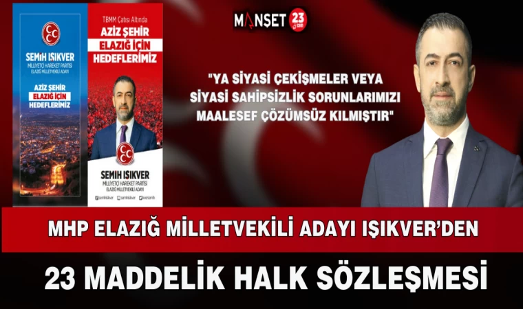 MHP Elazığ Milletvekili adayı Semih Işıkver, tüm siyasi parti ve adayların da kendisi gibi bir halk sözleşmesi hazırlayarak kamuoyu ile paylaşması gerektiğini ifade ederek, “Siyaset kurumunun Elazığ halkı üzerinde maalesef son 20 yıllık süreçte güvenirliği zedelenmiştir. Uzun bir süreden beri sahadayız. Neredeyse toplumun tüm kesimleriyle iletişim halindeyiz. Siyasetçilerin yirmi yılı aşkın bir süreden beri verdikleri sözlerin tutulmadığı, hatta ulaşılabilir olmada dahi çok ciddi sıkıntıların yaşandığı dile getiriliyor. İlimizin artık kaybedecek zamanı yok.