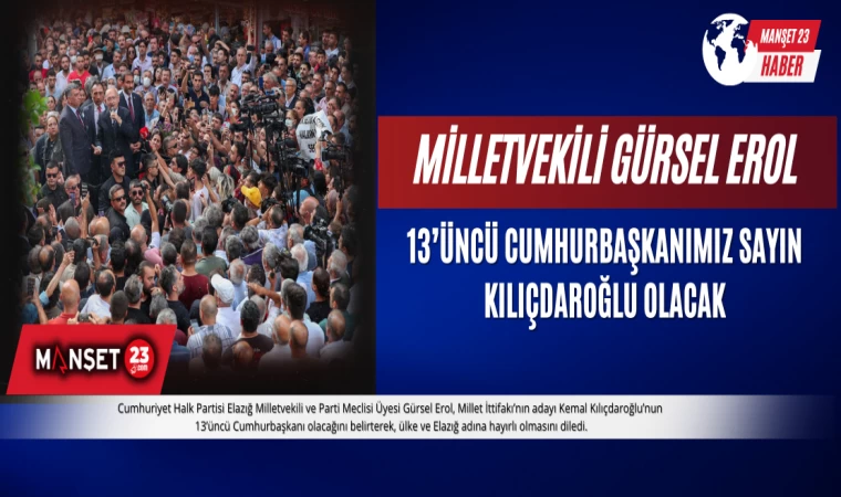 Cumhuriyet Halk Partisi Elazığ Milletvekili ve Parti Meclisi Üyesi Gürsel Erol, Millet İttifakı’nın adayı Kemal Kılıçdaroğlu’nun 13’üncü Cumhurbaşkanı olacağını belirterek, ülke ve Elazığ adına hayırlı olmasını diledi.