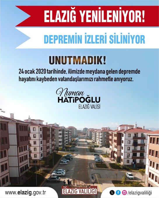 Elazığ Valisi Numan Hatipoğlu, 24 Ocak 2020 Sivrice merkezli depremin yıl dönümü dolayısıyla yayımladığı mesajda, hayatını kaybeden vatandaşları rahmetle andı; deprem sonrası yürütülen konut çalışmaları ve yeniden yapılanma sürecine dikkat çekti.